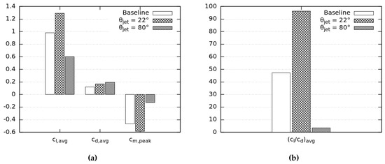 Several key parameters associated with the aerodynamic coefficients are computed with and without flow control, as shown in Figure 18. The cycle-averaged lift with no actuation is 0.97. In the case of the tangential jet, 1.29, about 33% increase from the baseline lift. The tangential jet also increases the average drag , about 42% increase from the baseline drag. It should be mentioned that the lift-to-drag ratio during the cycle increases drastically with the tangential jet. This is because (1) the lift is enhanced at low angles of attack when the drag remains small and (2) the drag increase is accompanied with the lift enhancement at high angles in the pitch (see Figure 15). The chord-normal jet depreciates the average lift 0.6. Therefore, the overall aerodynamic performance of the OA209 airfoil is improved with the tangential jet.