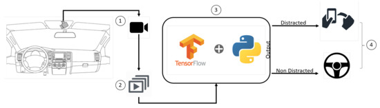 The flow chart of the proposed methodology is presented in Figure 1, where, in order to detect “texting and driving” or any other form of cellphone induced distraction, (1) a driver’s video is compiled from a wide angle GoPro camera (GoPro, Inc., San Mateo, CA, USA). Then, (2) each second of the video is split into 24 pictures with a resolution of 1980 × 1080. (3) These images are then used to feed a deep learning algorithm in order to train it to (4) accurately detect the distraction of “texting and driving”. In the next subsections, each stage is explained in detail.