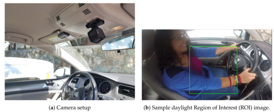 To detect the use of the cellphone while driving, a camera with a wide angle lens mounted in the middle of the ceiling car is used. The camera, which is a GoPro Hero 5 sessions camera with an equivalent 14 mm field of view angle, is mounted as depicted in Figure 2a and pointed towards the driver’s body, as shown in Figure 2b. With the camera positioned, a series of videos with a resolution of 1980 × 1080 and sample rate of 24 Hz were taken.