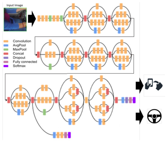 For this approach, the CNN is trained using a “transfer learning” technique [28], where the final classification layer from the network presented in Figure 3 was retrained for 5000 epochs with the dataset collected in this research [29,30] and optimized to detect the presence of cellphones while driving. The rest of the layers are fine-tuned using the original learning parameters [27]. Inception CNN was chosen due the fact that such CNN can be exported for low cost hardware such as Raspberry Pi and can be deployed in Android platforms; furthermore, the CNN architecture acted as multiple convolution filters that were then applied to the same input; the results were then concatenated and passed forward. This approach allowed the model to take advantage of multi-level feature extraction. The CNN Inception V3 is based on a pattern recognition network, and it is designed to use minimal amounts of image pre-processing. Each of the proposed CNN layer reinforces key features; the first layer detects edges, and the second tackles the overall design, among others [29].