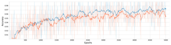 The accuracy obtained by the CNN is shown in Figure 5, where the blue line represents the behavior of the training data, obtaining a final accuracy of 0.93, while the orange line represents the behavior of the testing data, obtaining a final accuracy of 0.98.