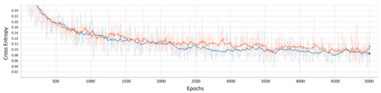 Graph of the cross entropy obtained along the 5000 epochs, red line = train data, blue line = validation data.