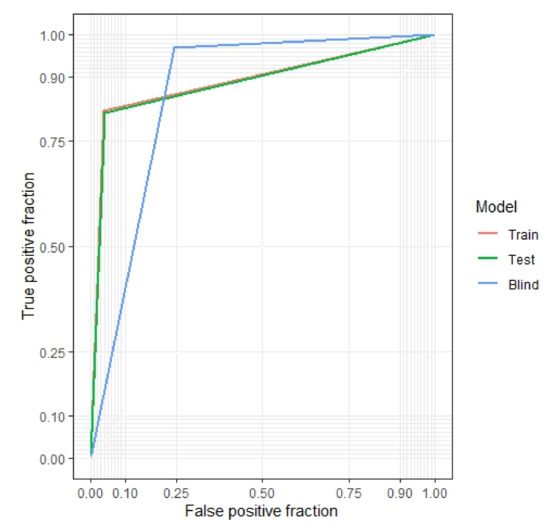 The ROC curves obtained are shown in Figure 7, where the training subset presented an area under the curve (AUC) value of 0.89 (red line), the testing subset presented an AUC value of 0.88 (green line), and the blind subset presented an AUC value of 0.86 (blue line).