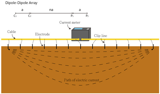 The simulated testing method in this study adopted dipole–dipole electrode arrangement. The electrode sequence of the dipole–dipole array was C2, C1, P1, P2, respectively. The two current poles form a dipole, and the two potential poles form another dipole, where C1C2 = P1P2 = a and C1P1 = na. When the parameter n is gradually increased, the resistivity of the formation changing from shallow to deep can be obtained. The high sensitivity of this arrangement is concentrated between the paired current poles and the potential poles, so horizontal formation changes are more suitable, while the vertical direction changes poorly.