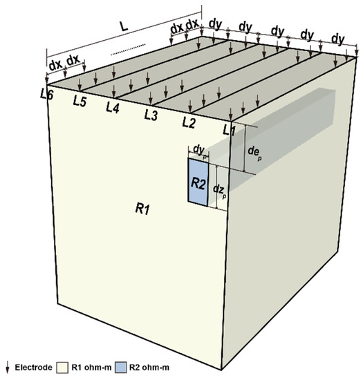In the model, the resistivity of the pipelines is R2, the soil layer resistivity is R1, R1 > R2, and the ratio of the two is n (n = R2/R1). To discuss the influence of the resistivity ratio under this assumption, we fixed R1 as 1000 ohm-m, and set R2 as 10, 50, 100, and 250 ohm-m, respectively. The section size of the pipelines was dyp × dzp, and the depth of the embedding was dep = 2 m (the top of the pipeline). The parallel pipelines around the pipeline setting were 5 to 6 lines, each line was separated dy = 3, the spacing to electrode rods was dx = 3, and each line had a slight adjustment to the length of line L with the sounding requirement. Table 1 presents the explanatory table of the 3D effect model parameter with the pipeline formation.