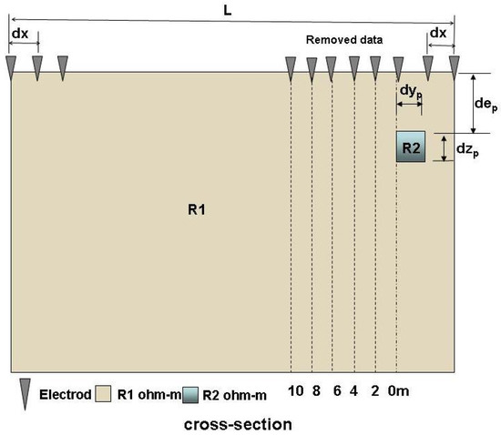 This study explored the aspects of the resistivity ratio, electrode spacing, the influence distance of the boundary effect, medium depth, and medium size through parametric variation. In the model, it set that the resistivity of the background soil layer was R1, the resistivity of the boundary medium was R2, the section size of the medium was dyp × dzp = 2 × 2 m2, the embedding depth was dep = 2 m, the spacing of the electrode rods was dx = 2, and the length of the survey line was L = 50 m. Table 2 is the explanatory table of the boundary effect model parameters.