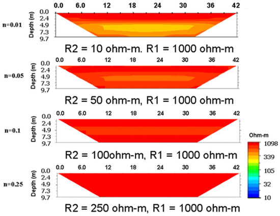 In the case of n < 1 (R2/R1), with the increase in the resistivity ratio value n, the influence of the boundary effect gradually decreased. As shown in Figure 9, there was an abnormal resistivity value zone in the resistivity profile when the resistivity ratio value n was under 0.1, and was not obvious until the value n reached 0.25. That is, when resistivity ratio is under about 0.1, there are concerns about the boundary effect, which is similar to the situation of the 3D effect.