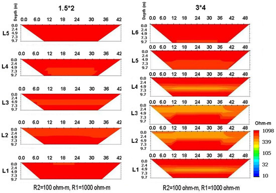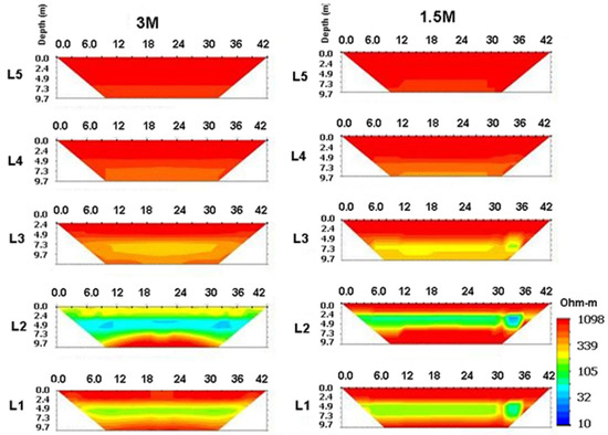 Figure 6 shows the results of testing the 2D ERT near two different pipeline sizes. Due to the pipeline sizes, the distances between the L1~L5 lines of the small-scale pipeline and the boundary of the pipeline were 1.5, 0, 3, 6, and 9 m, respectively, and the distances between the L1~L6 lines of the large size pipeline and the boundary of the pipeline were 0 (the left side of the pipeline), 0 (the right side of the pipeline), 3, 6, 9, and 12 m, respectively. In the case of the small pipeline, there was a nonsignificant 3D effect outside the line of the boundary, but in the large size pipeline, line L4 (6 m away from the edge of the pipeline) shows the mapping results of adjacent pipelines. The results show that the influence of the 3D effect increases with the size of the pipeline.
