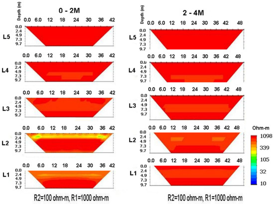 Figure 7 shows the 2D ERT results of the small pipeline with an embedding depth of 0 m and 4 m. Compared with the L1 lines (the horizontal distance from the buried pipeline was 1.5 m), when the embedding depth was 2 m, we could obviously observe the mapping phenomena, but when the embedding depth increased to 4 m, the 3D effect was not as obvious. This shows that as the depth increased, the influence of the 3D effect weakened, and the influence range seems to be related to the distance from the line to the pipeline, and not the horizontal distance.
