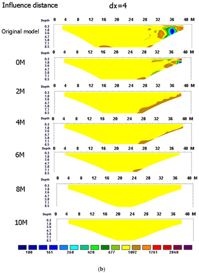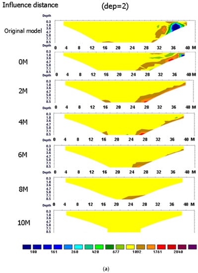 To understand the influence distance of the boundary effect, this study set the resistivity ratio n = 0.1 and electrode spacing dx = 2. These results are shown in the left image in Figure 12, where the resistivity profile obviously had an abnormal resistivity zone within 6 m from the boundary medium, which was obviously affected by the boundary effect. However, after 8 m away from the boundary medium, it was almost unaffected by the boundary effect. This result is similar to the influence distance of the 3D effect.