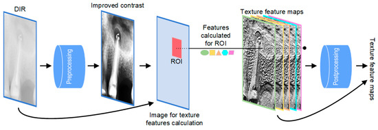 - Texture feature map computation—the digitized radiographs were of various quality, therefore some standardization was necessary. Sometimes, improving the contrast by image processing methods (e.g., histogram stretching or equalization - HISTEQ) was sufficient, yet in the presented problem it was not satisfactory. Therefore, for each image a set of texture feature maps were prepared. Those maps may also be characterized with low contrast, hence again (as in the preprocessing step) the standard methods for its improvement were applied in the post-processing stage.