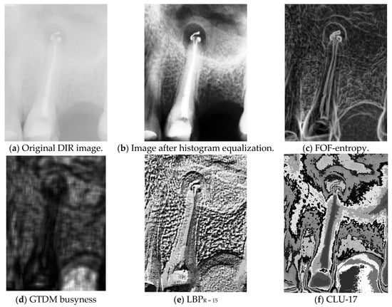 Various aspects of image preprocessing. (a) Original data. (b) The same image after histogram equalization shows improved contrast but does not depict the structure clearly in the tooth region. (c–f) Examples of feature maps derived from a digital intraoral radiographic image via various texture analysis methods. CLU, clustering with k-means approach; DIR, digital intraoral radiography; FOF, first-order features; GTDM, gray-tone difference matrices; LBP, local binary patterns.