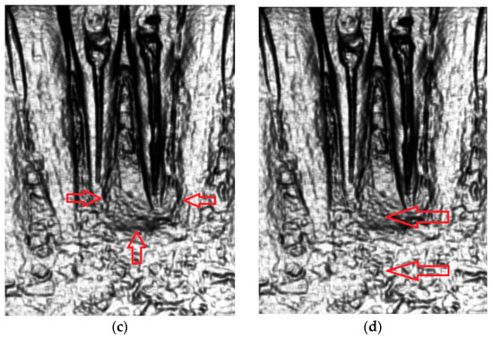 Example of assessment of a periapical lesion. (a) Entry digital intraoral radiographic image. (b) Differentiation of radiodensity in the lesion (different shapes are pointed out by the arrows). (c) Border definition (pointed out by small arrows). (d) Tissue contrast between lesion and the neighborhood (shown by the arrows).