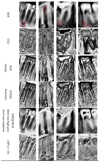 The native DICOM images and texture feature maps obtained were analyzed on a 4K retina monitor by two radiologists with 10 and 30 years of experience in analysis of classical bone radiograms including dental. Standard DIR images were assessed first. The pictures were then examined separately using the techniques described above, i.e., CLU, COM, FOF, GTDM, RLM, and LBP. The prepared feature images were evaluated for radiodensity, border definition, and tissue contrast. Figure 3 presents the analyzed regions. The aforementioned parameters were estimated separately to evaluate assumptive improvement of visualization and the subsequently increased accuracy in detection of periapical lesions. Radiodensity analysis was used to evaluate bone density changes, border definition presented edge definition of the changes, and gray-scale contrast meant tissue contrast was used for evaluation of the lesion character. All features were summarized in the evaluation chart. Results were encoded in 1/0 code where 0 meant lack of the recognition of the feature and 1 meant its visual confirmation. In order to comprehensively evaluate the texture feature map usability, two main clinical issues were analyzed—sclerotic lesions and lytic lesions. Interrater reliability was at the level of 98% (on the basis of concordance correlation) where doubtful cases were established on the basis of interrater consensus.