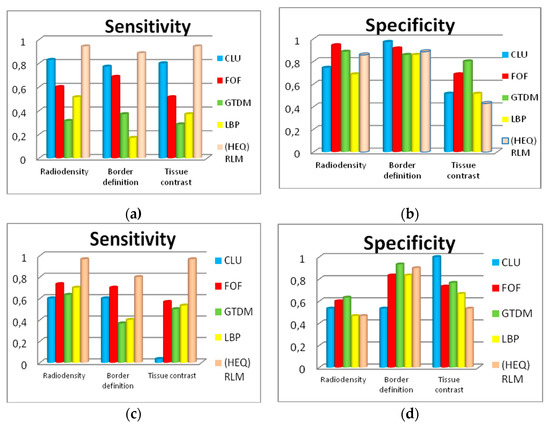 Sensitivity and specificity of different texture feature maps for detection of lytic (a,b) and sclerotic (c,d) lesions. CLU, clustering with k-means approach; FOF, first-order features; GTDM, gray-tone difference matrices; HEQ, histogram equalization; LBP, local binary patterns; RLM, run-length matrices.