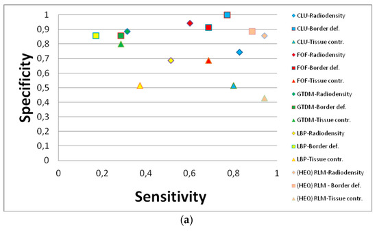 The potential utility of each method was calculated based on data derived from experts, and changes are expressed as sensitivity and specificity for the different groups of texture feature maps that are gathered in the bar plots presented in Figure 5. All samples presenting lesions and marked as such by experts take place for true positive (TP) cases. When there was a change unnoticed by the expert, there was a true negative (TN) result. Then, when the expert noticed the change in the DIR data without lesions, a false positive (FP) result was recorded. False negative (FN) results corresponded to the situation in which the data presented any changes, and the expert confirmed it. Consequently, the formulas for sensitivity and specificity are as follows: