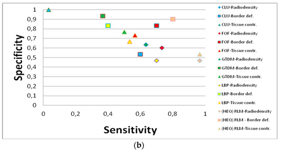 Relationship between specificity and sensitivity for (a) lytic lesions and (b) sclerotic lesions. Generally, the higher both values are, the better the parameter. CLU, clustering with k-means approach; FOF, first-order features; GTDM, gray-tone difference matrices; HEQ, histogram equalization; LBP, local binary patterns; RLM, run-length matrices.