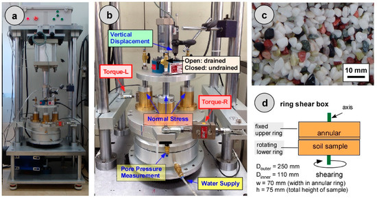 A ring shear apparatus is commonly used to examine the residual shear strength of soils based on a shear stress–shear strain relationship. It is a well-known special instrument with an artificial slip surface that allows for measurements of the shear stress when forces act on a sample [25,26,27]. One of the main advantages of the ring shear test is the unlimited shear deformation developed in a soil sample. There is a constant contact area during the test, so extra stress concentration with large shear deformation does not occur [8]. To investigate the undrained shear strength of soils, a large-sized ring shear apparatus was developed by various researchers [17,25,26,27,28,29]. This ring shear device is easy to assemble and has simple drainage and shear velocity control systems (Figure 1). The device incorporates one of the largest ring shear boxes, with a maximum outer diameter of 250 mm. It is applicable for both fine- and coarse-grained sediments. The samples were contained in the ring shear box, which is also called the ring shear cell [30]. Vertical loading can be applied to the samples through three piston chambers (Figure 1a,b). However, normal stress-dependent frictional strength and shear zone formation were beyond the scope of this study.