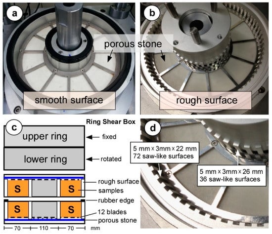 The annular-like shape of the ring shear box has an inner diameter of 110 mm, an outer diameter of 250 mm, and a height of 75 mm (Figure 2). The width between the inner and outer sides of the annular-shaped shear box is 70 mm. The height of the materials in the ring shear box can be varied from 70 to 80 mm, but a fixed height of 75 mm was applied in the tests. In this context, a wide range of large particle sizes (e.g., 0.075–10 mm) can be accommodated within the box. To minimize the slip effect, surface roughness is required for many types of instruments when investigating an engineering problem. In some tests, a thick sand cover with a rough surface texture was used for clayey to sandy soils. In this study, two types of ring shear boxes with smooth (classic) and rough (serrated) surfaces were made and placed inside the inner and outer sidewalls of the ring shear box to examine the frictional and fragmentation effects during shearing. No roughness was considered for the classic ring shear box except at the top and bottom. In the upper and lower plates, a combination of porous stone and 12 saw-like surfaces was used. The rough surfaces in the second ring shear box were located inside the inner and outer sides of the hollow cylinder box (Figure 2b–d). The dimensions of the rough surfaces were fixed. The thickness, width, and height were 5 mm, 3 mm, and 22 mm, respectively, for the lower ring, and 5 mm, 3 mm, and 26 mm, respectively, for the upper ring. In total, there were 32 inner rough surfaces and 72 outer rough surfaces. Because of the dimensions of the rough surfaces, large particle sizes were well sheared at the inner and outer perimeters of the shear box. In particular, the roughness was considered capable of directly affecting the gravelly soil tested (mean grain size of 6 mm).