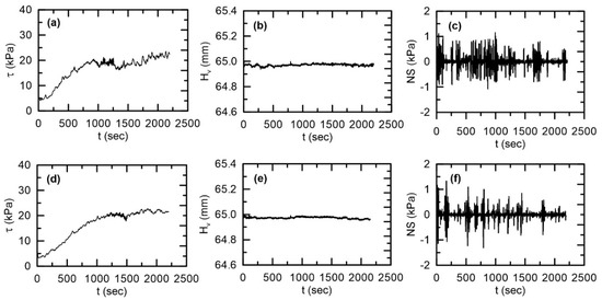 Ring shear tests were initially performed using a classic smooth surface for the aquarium gravel with a normal stress of 0 kPa and a velocity of 0.5 mm/s. The mechanical properties of materials can often be described by their shear stress and shear strain (or displacement) relationship in response to the applied load. Figure 3 shows that in the shear stress–shear time relationship, the particles exhibited a typical strain-hardening behavior, regardless of the drainage condition, which implies that shear stress increases with increasing shear strain. This may be considered a shear resistance (i.e., yield strength) occurring at the beginning of plastic behavior based on the rheology. There was no contractive or dilative behavior apparent during shearing. Because the normal stress remained constant during shearing, very little decrease in the height of the sample was observed (the variation was less than 0.1 mm). According to Terzaghi et al. [31], typical dense sand and over-consolidated clays are dilative, while loose sands and normally consolidated clays are contractive. There was little effect based on the drainage condition. At the end of the test, as shown in Figure 3, the maximum shear strength was approximately 20 kPa. The minor variation in normal stresses with both drained and undrained conditions was caused by particle rearrangement, interlocking, and fragmentation along the artificial sliding plane during the ring shear test (Figure 3c,f). In the drained condition, after 1200 s, there was a slight decrease in shear stress, which may occur because the strain localization due to grain crushing was more significant in the drained condition; the large particles in the drained condition could freely move from the upper part to the middle part (artificial sliding plane) within the ring shear box. Similar results were reported by Sassa et al. [26]. The pore water pressure is also an important factor in determining the shear strength in the undrained condition, but in this study, this value was not a major factor because it strongly depends on the drainage and shear velocity. Thus, the measurement of pore water pressure was not considered.