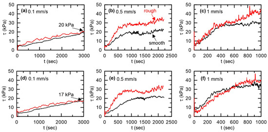 Comparison between smooth and rough surfaces for different shear velocities of 0.1, 0.5, and 1 mm/s: (a–c) Drained and (d–f) undrained conditions. (a,d): 0.1 mm/s; (b,e): 0.5 mm/s; and (c,f): 1 mm/s.