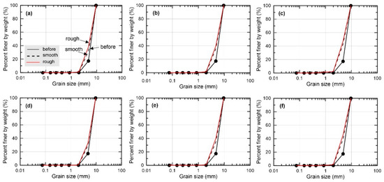 Grain crushing effect with respect to surface roughness: (a–c) Drained and (d–f) undrained conditions. (a,d): 0.1 mm/s; (b,e): 0.5 mm/s; and (c,f): 1 mm/s.