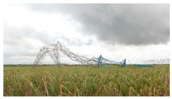 - Jiang, Y.; Pan, C.; Zhuang, Z.; Li, M. Analysis of collapse accident of transmission line tower causing by typhoon attacking in the coastal district of Guangdong province. South Energy Constr. 2016, 3, 82–87. (In Chinese) [Google Scholar]
