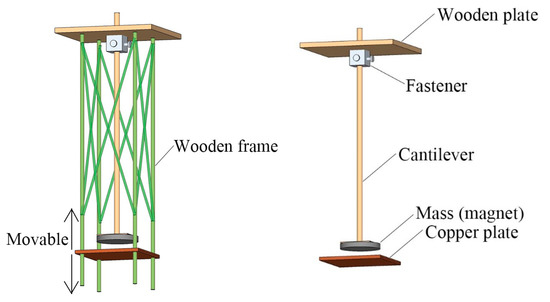 An omnidirectional cantilever-type ECTMD was designed for the wind tunnel test of an aeroelastic tower model. As shown in Figure 2, the vertical cantilever is attached with a circular mass block that moves parallel to the copper plate. The mass block is made of magnet. The copper plate is to be fixed on the tower model. The stiffness of the ECTMD is provided by the cantilevered beam with a circular cross section, while the damping is achieved by the relative movement between the magnet and the copper plate. The four columns of the exterior wooden frame penetrate through the small holes on the copper plate. The connection between the frame and the copper plate was strengthened by removable hot melt adhesive, if the distance between the mass and the copper plate are determined. Thus, the distance can be changed independently from the cantilever length by removing the hot melt adhesive.