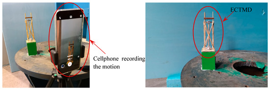 Dynamic characteristics of the ground-mounted ECTMD were identified through free vibration tests. The experimental setup of the free vibration tests is shown in Figure 4. To achieve a free vibration of the magnet, the magnet is given an initial displacement and is then released. A computer vision-based approach with corresponding identifying method [36] for dynamic displacement response is employed in the free vibration test of the ground-mounted ECTMD. A Huawei Mate 20 Pro cellphone was employed to record the video of motion, and the frame rate is 235 frames per second.