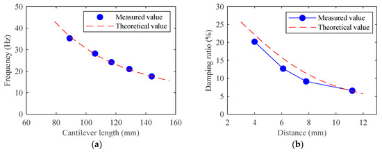 Dynamic characteristics of ECTMD. (a) ECTMD frequency varying with cantilever length; (b) Damping ratio varying with distance between copper plate center and magnet surface at ECTMD frequency of 24 Hz.