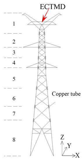 For robustness, the vibration control device installed on a lattice tower needs to be capable of controlling the vibration of the structure under different wind directions. In addition, the device needs to mitigate the along-wind response and across-wind response of the tower simultaneously. Hence, it is of great significance to design an omnidirectional device that is able to accommodate different wind directions and vibration directions. Eddy current tuned mass damper (ECTMD) is a newly developed and promising device for vibration mitigation. It has been implemented in tall buildings [14] and transmission towers [27], and has attracted considerable interest [28,29,30]. For a traditional TMD in which viscous dampers are used to provide damping, it is found that there exists a concern of fluid leakage, and the damping adjustment is difficult. The concerns raised can be attenuated by using ECTMD, in which an eddy current is employed to provide the damping. The relative movement between the magnetic field and the conductor in the device produces a damping force approximately proportional to the relative velocity, which can be considered linear damping [31] in the case of an ECTMD mass swaying in small amplitude. The separation of damping and stiffness in an ECTMD makes it potentially feasible to design an adjustable TMD for performing passive [32,33] or semi-active vibration control in the further study.