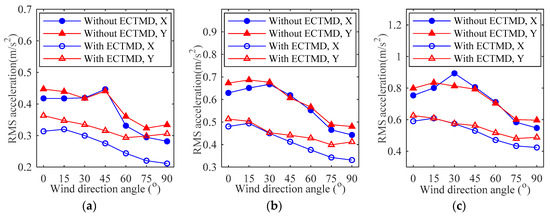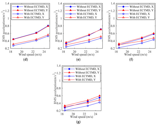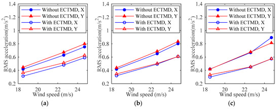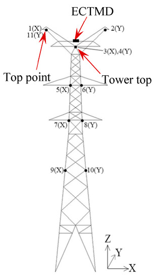 where and are the RMS acceleration responses of tower top (‘tower top’ is indicated in Figure 10), with and without ECTMD respectively. The measurements of the acceleration sensors at 1.34 m, namely 3(X) and 4(Y), are employed as the representative measurements for the aeroelastic model response in wind tunnel tests. That is to say, the results in the following Section 4 and Section 5 are of the tower top.