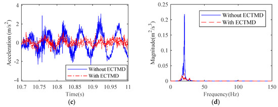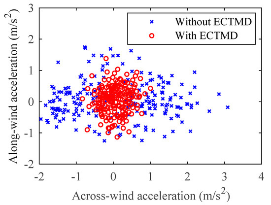 Figure 15 shows the dynamic acceleration responses of the tower top in both time domain and frequency domain, in the case of the favorable frequency ratio and damping ratio tuned for ECTMD. It is found that both the vibration amplitude in the time history and the resonant component of frequency response at the fundamental frequency are significantly suppressed by the ECTMD. In addition, only the first mode has a significant contribution to the response, and the modes with higher modal frequency are not accessible within the frequency range. Figure 16 presents a diagram of bi-directional responses of the tower top, in which the along-wind data is the data in Figure 15a within the duration of 10.9 s to 11.0 s. It is clearly observed that the ECTMD can mitigate the vibrations in the across-wind direction and the along-wind direction in the meantime.