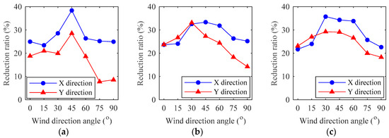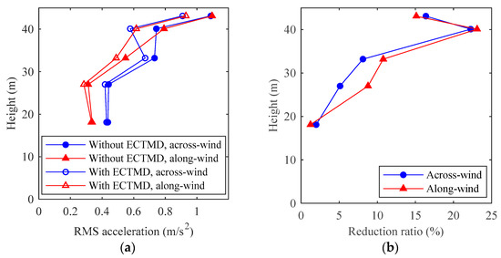 Acceleration responses and reduction ratios along height under wind speed of 24.7 m/s and wind direction angle of 0°. (a) Acceleration responses; (b) Reduction ratios.