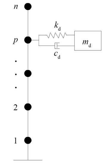 where m, c, and k are the mass, damping and stiffness matrices of the primary structure respectively, x is the displacement vector, , is the pth nodal displacement at the attaching point of the ECTMD, is the displacement of the ECTMD, , and are the mass, damping coefficient and stiffness of the ECTMD respectively, L is the location vector of the ECTMD, and f(t) is the vector of wind loading. Note that for the simplified model shown in Figure 21, m is a diagonal matrix, i.e.,