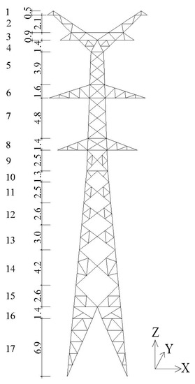 The tower is divided into 17 segments, as shown in Figure 22, and the relevant parameters are listed in Table 5. Thus, for numerical analysis, a simplified model with 17 corresponding nodes is employed. The location of each node is set at the center of the corresponding segment. Therefore the rth lumped mass is the mass of the rth segment. The mode shapes used herein are derived from the finite element analysis of the prototype structure, in which seventeen mode shapes with corresponding natural frequencies are obtained. The modal damping ratios of the first two modes in the Y direction are set as 4.4%, which is identified from the experimental dynamic response results. Thus, the modal mass, modal damping and modal stiffness matrixes can be computed, according to Equations (18)–(20).