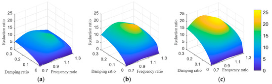 Reduction ratio over damping ratio and frequency ratio. (a) Mass ratio = 0.02; (b) Mass ratio = 0.04; (c) Mass ratio = 0.063.