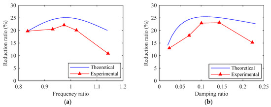 By using the parameters in the experiment, the theoretical results are compared with the experimental results in the along-wind direction, as shown in Figure 24 and Table 6. It can be found from Figure 24 that the theoretical reduction ratios generally match well with the experimental values as the frequency ratio and damping ratio of the ECTMD change, though the experimental reduction ratios are a little lower. The theoretical highest reduction ratio corresponds to the frequency ratio of 0.97 and the ECTMD damping ratio of 0.11, whereas the experimental highest reduction ratio corresponds to the frequency ratio of 0.97 and the ECTMD damping ratio of 0.14. Under the frequency ratio of 0.97 and the ECTMD damping ratio of 0.14, the experimental reduction ratio is 23.1%, whereas the theoretical reduction ratio is 24.8%.