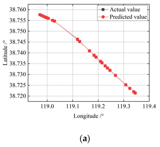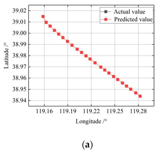 To verify the generalization performance of the model, the ACDE-SVR algorithm was used to predict and compare different trajectories. Six trajectory sequences from different ships were randomly selected and some of the six trajectories were arbitrarily selected as sample data for model training and prediction. In order to facilitate the comparison of the prediction results of different trajectories, the six ship trajectories are respectively marked as a-f trajectories. Comparisons between the predicted values of the six trajectories and actual values are shown in Figure 8, Figure 9, Figure 10, Figure 11, Figure 12 and Figure 13 and the specific prediction errors are shown in Table 7. It can be roughly seen from Figure 8, Figure 9, Figure 10, Figure 11, Figure 12 and Figure 13 that the prediction error orders of magnitude are −4 or −5 and the predicted values are essentially consistent with the actual values. To further analyze the prediction errors of the different trajectory sequences, the analysis in Table 6 was carried out, which clearly shows that the prediction error of the a-trajectory is the largest. The MAE of latitude and longitude is 3.007 × 10−4° (33.41 m), which is within the allowable range and can thus meet the collision avoidance requirement. The other trajectory errors are smaller than that of the a-trajectory and thus can also meet the collision avoidance requirement. In summary, the trajectory prediction model based on ACDE-SVR has high generalization capability and can be applied for collision avoidance.