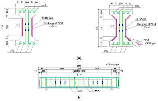 Figure 3 shows the manufacturing process for the specimens. Initially, concrete beams with an I-shaped profile were produced and then cured for 28 days. Subsequently, original beams were polished by vacuum blasting for surface treatment before the CFRP grid was attached to the lateral surface of the concrete beam, with rivets used as temporary anchorage. Finally, in order to avoid the occurrence of dehydration phenomenon, primer mortar was sprayed or painted prior to PCM shotcrete.