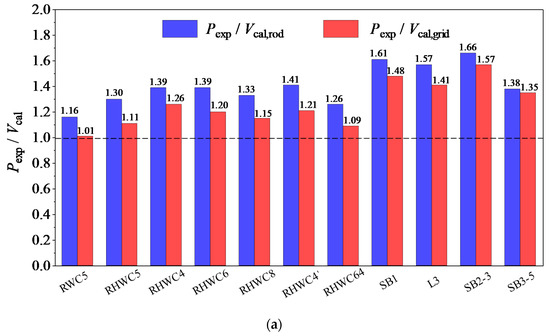 Considering the new definition for the strain, the values for shear can be re-evaluated (labelled as Vcal,grid and shown in Appendix A) and compared with those obtained previously (Vcal,rod) in Table 9. The comparison is plot as the chart of Figure 13a. Again, the safety ratios of Pexp to Vcal,grid are beyond 1.00 so they satisfy the safety requirement. Similarly, the strain value (εu,grid) can be re-evaluated, and the values result much closer to the measured ones, as shown in Figure 13b. It can be deduced that the latter calculated system, which is proposed to evaluate the shear capacity for concrete beams externally bonded with a CFRP grid-PCM reinforcement layer, is demonstrated to be a more reasonable approach than the previous method.