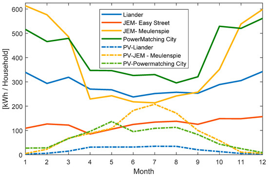Monthly electricity consumption (solid line) and photovoltaic (PV) production (dashed line) profile over the year for all the datasets. JEM, Jouw Energie Moment.