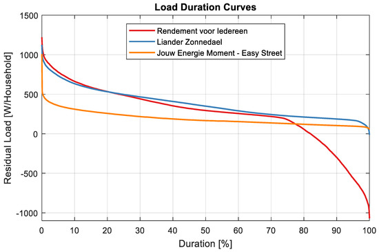 Load duration curves of the “Smartgrid: Rendement voor Iedereen” project, the Liander Zonnedael open access dataset, and the “Jouw Energie Moment” project (exclusively Breda-Easy Street).