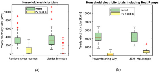 Boxplots of annually imported electricity from the grid and surplus PV (feed-in) to the grid for (a) household without heat pumps and (b) households with heat pumps. For each box, the red line indicates the median, and the bottom and top edges of the box indicate the 25th and 75th percentiles, respectively. The whiskers extend to the most extreme data points without considering the outliers, and the outliers are plotted individually in red.