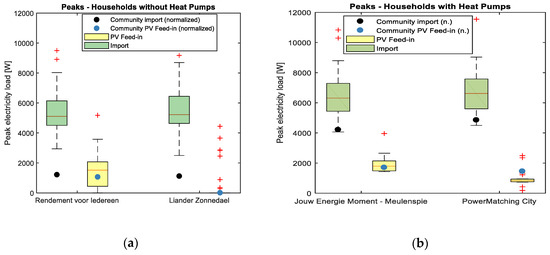 Boxplots of annually imported electricity from the grid and surplus of PV generated electricity (feed-in) to the grid, based on 15 min averages. (a) results for Rendement voor Iedereen pilot and Liander (without electrical heating), (b) results for Jouw Energie Moment-Meulenspie and Power Matching City (with electrical heating). For each box, the red line indicates the median, and the bottom and top edges of the box indicate the 25th and 75th percentiles, respectively. The whiskers extend to the most extreme data points without considering the outliers, and the outliers are plotted individually in red. The black dots represent the normalized import peak for the whole community, and the blue dot represents the normalized PV feed-in peak.