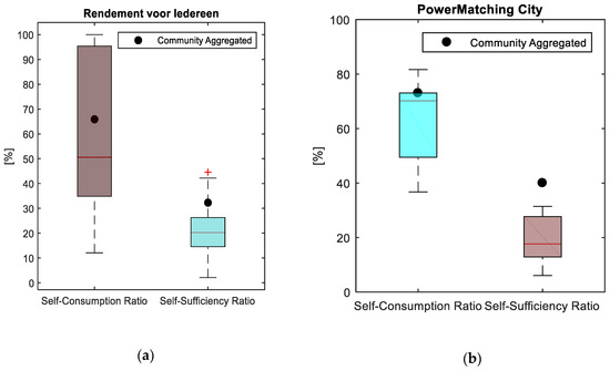 Boxplots of annual self-consumption and self-sufficiency ratios. (a) results for Rendement voor Iedereen pilot and (b) for Power Matchig City. For each box, the red line indicates the median, and the bottom and top edges of the box indicate the 25th and 75th percentiles, respectively. The whiskers extend to the most extreme data points without considering the outliers, and the outliers are plotted individually in red. The black dots represent the community aggregated values for self-consumption and self-sufficiency.