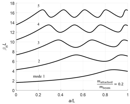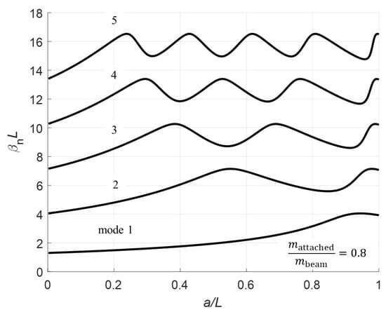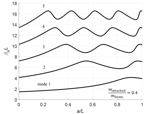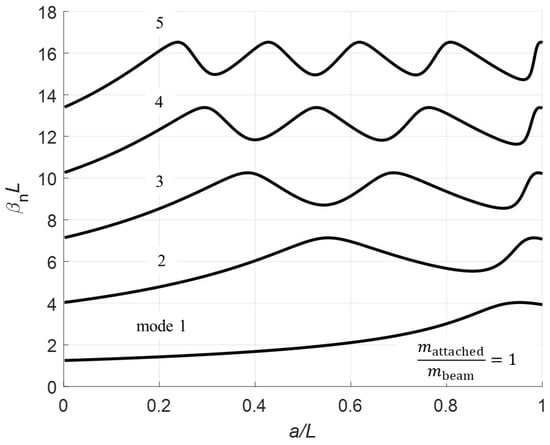 The mode shapes are calculated for the two different sections of the beam corresponding to the clamped-pinned and pinned-free sections. To calculate the mode shapes, the boundary condition (Equations (6)–(13)) are used to find a relationship between the coefficients. The method used here consists of solving all coefficients in terms of . Note, there are not enough equations to determine a unique solution for each coefficient. The solutions for the a coefficients are: