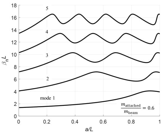 The beam vibration eigenvalues are calculated in terms of for different mass ratios, . The eigenvalues are plotted as a function of the normalized pinned location, in Figure 2, Figure 3, Figure 4, Figure 5 and Figure 6. Note, the values corresponding to is equivalent to the clamped-free system with a mass at the free.