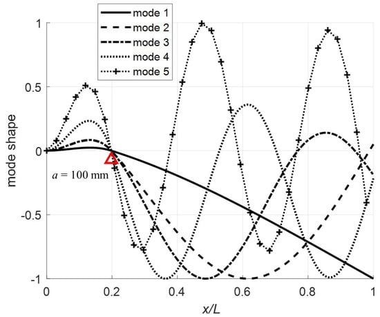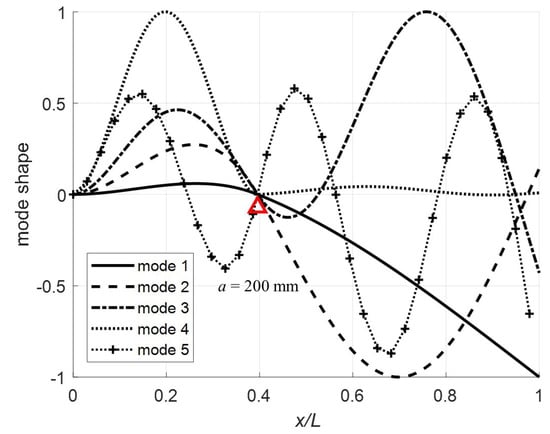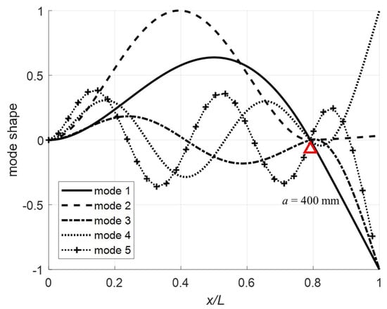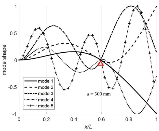 Normalizing at , the first five mode shapes for the clamped-pinned-free beam with a mass at the free end are plotted in Figure 7, Figure 8, Figure 9 and Figure 10 for a = 100, 200, 300, and 400 mm with . The red triangle on the plots denotes the pin location. Note that for (Figure 7), the mode shapes are as expected for a fixed-pinned-free cantilever beam with a mass on the free end. However, when (Figure 8), mode shape 4 is highly non-symmetric because the constraint point (pin) is just past the node and in combination with the effect of the mass this mode shape flattens out for the remainder of the beam. For (Figure 9) and (Figure 10) the more expected sinusoidal shape dominates the mode shapes.