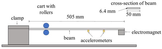 In this section, the theoretical results are compared with experimental data. The experimental setup is illustrated in Figure 11. A cart with rollers is used as a moving pin along the beam. Accelerometers are attached at locations 300 mm and 400 mm. The mass of the accelerometers is assumed to have a negligible effect. Each accelerometer weighs 1.7 gm, not including cables, which is 0.2% of the weight of the beam. At the free end, an electromagnet is used to simulate the point mass. The specifications of the experiment are listed in Table 4.